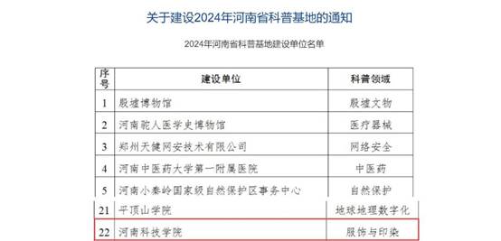 近日,河南省科技厅公布了河南省科普基地建设的审评结果,我校中原服饰文化馆成功入选河南省科普基地建设,我校荣获河南省科普基地建设单位。近年来,我校深入实施全民科学素质行动计划,以创建河南省科普基地为抓手,大力弘扬科学家精神,积极推动科学技术普及,着力激发创新活力,致力于营造尊重知识、尊重人才、尊重创新、尊重创造的科学氛围。截至目前,我校已获批省级科普(教育)基地2个。
