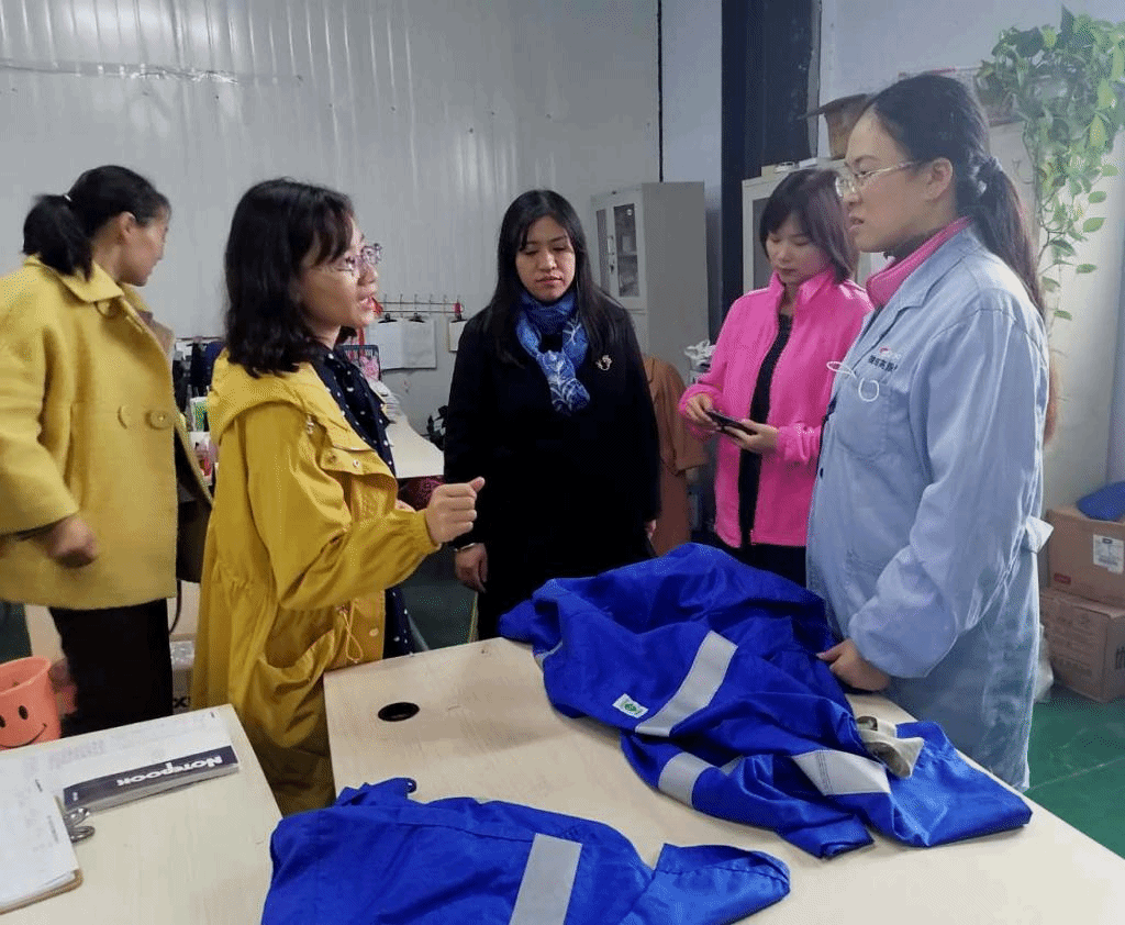 在新科防护科技有限公司,王式竹一行就产教融合、联合培养科技创新型服装专业技术人才、开发新型产品、技术服务等相关问题,分别与公司技术部、设计部、生产部主管进行深入讨论与磋商,为进一步推进校企合作的实施和落实达成初步共识。