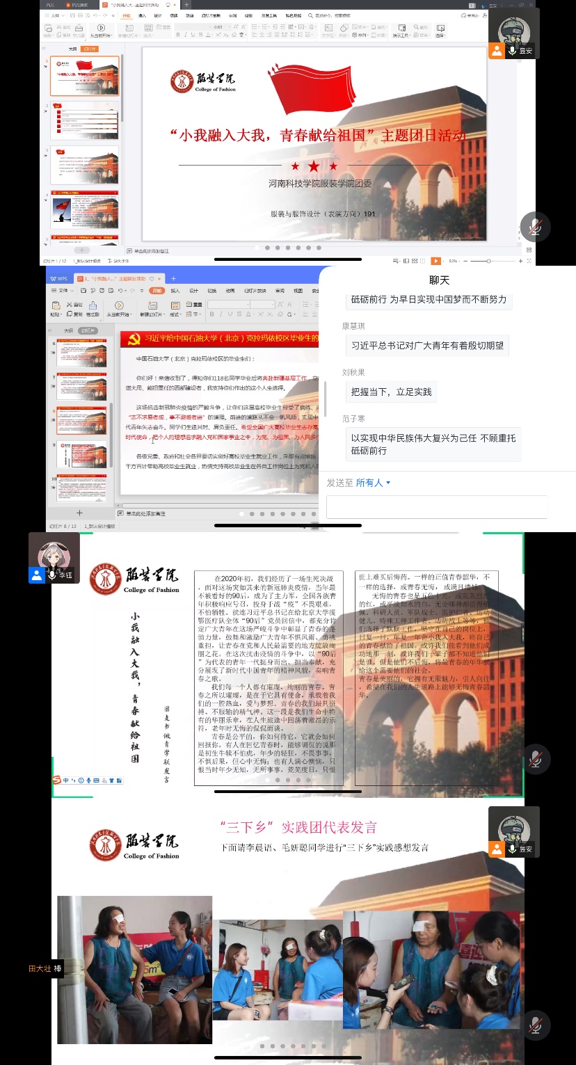 团委组织安排各团支部开展线上主题团日活动,全体辅导员老师参与到各个团支部的线上活动中来。同学们一起认真学习习近平总书记五四寄语、给北京大学援鄂医疗队全体“90后”党员回信、给复旦大学《共产党宣言》展示馆党员志愿服务队全体队员回信、给中国石油大学(北京)克拉玛依校区毕业生回信精神、“习近平与大学生朋友们”系列访谈实录等。集体学习习近平总书记致全国青联十三届全委会全国学联二十七大贺信精神后,各班团支书发表学习感悟,同学们也积极参与发言,他们纷纷表示,习近平总书记的贺信不断激发大家青春建功新时代的磅礴力量,鼓励青年人积极投身新时代中原更加出彩的生动实践。各班参与暑期“三下乡”活动的学生代表在会上发言,和同学们一起分享实践心得。最后,辅导员老师对团日活动做总结发言。