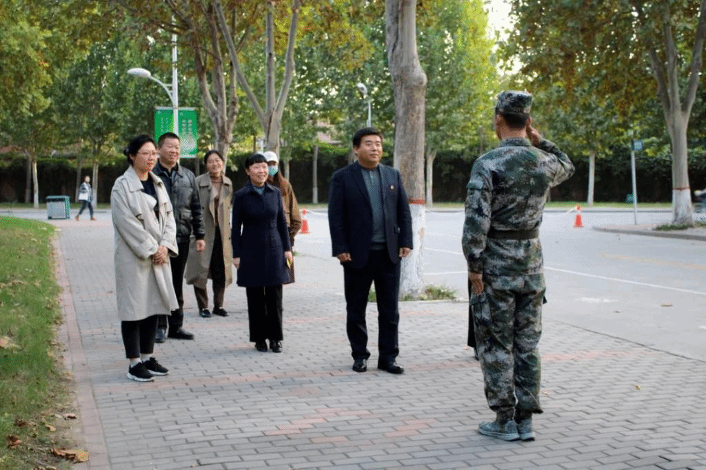 党委书记郭建勋,院长常丽霞,党委副书记吴峰,办公室主任张纪文,团委书记梁瑞及新生辅导员刘颖莹一起来到新生军训场地,视察军训情况,看望教官和全体军训学生。