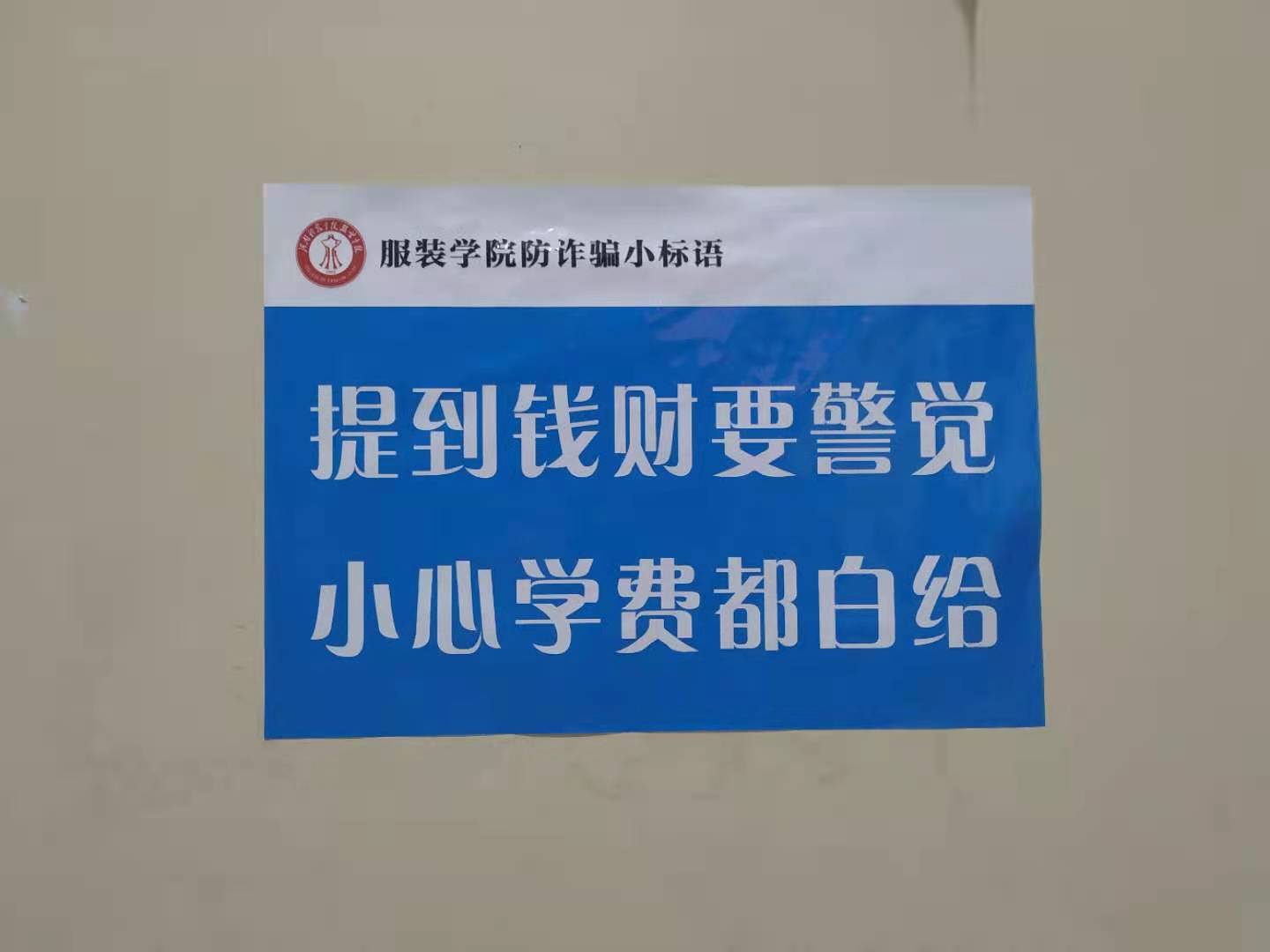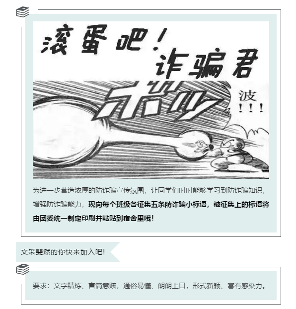 的传统特色活动之一。通过向全院同学征集防范电信诈骗小标语,筛选出受学生喜爱的标语,张贴在宿舍醒目位置,时刻提醒同学们提高警惕,不给骗子可乘之机。
