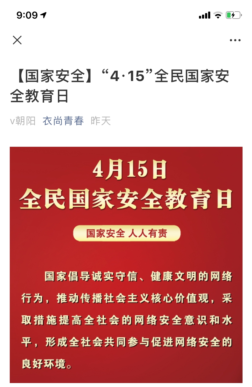 利用“衣尚青春”公众号,发挥新媒体优势,利用同学们喜爱的方式加强国家安全教育的宣传教育。