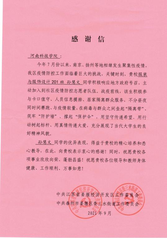 今天,服装学院收到一封特殊的感谢信,感谢服装学子在疫情防控中的奉献和担当。