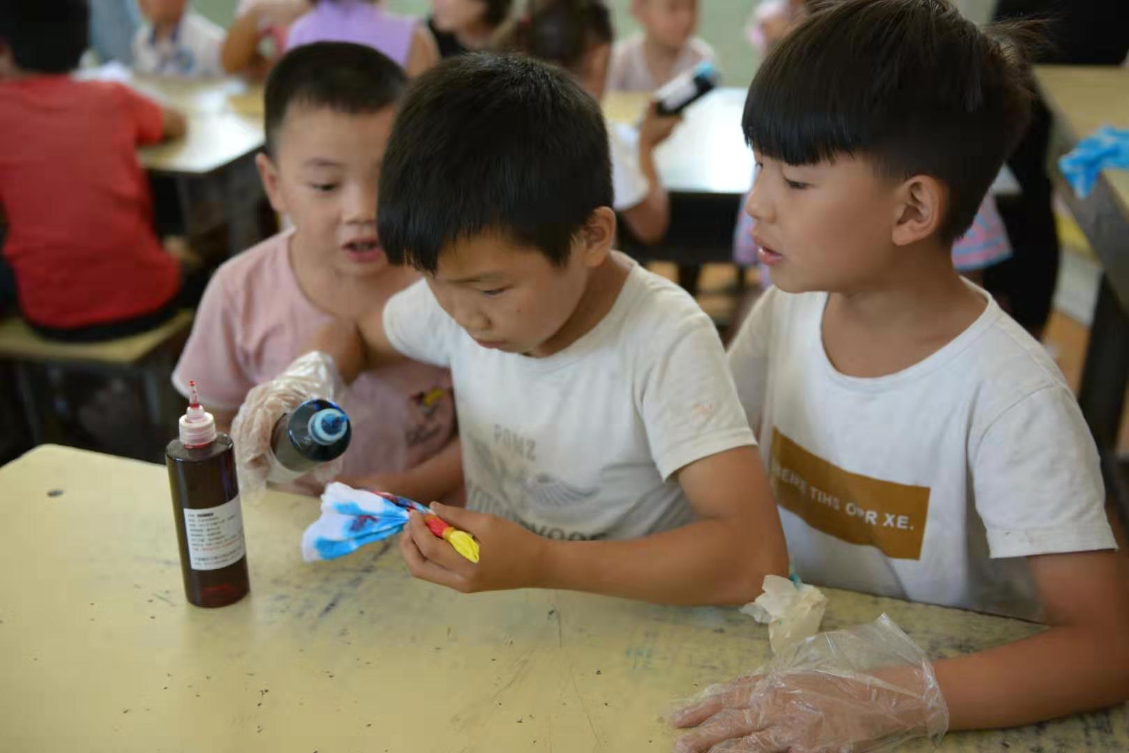 “传承扎染艺术,共建美丽乡村”的15名青年实践团队员走进封丘县董堤村,把历史悠久的扎染艺术带到田间校舍,助力美丽乡村建设。