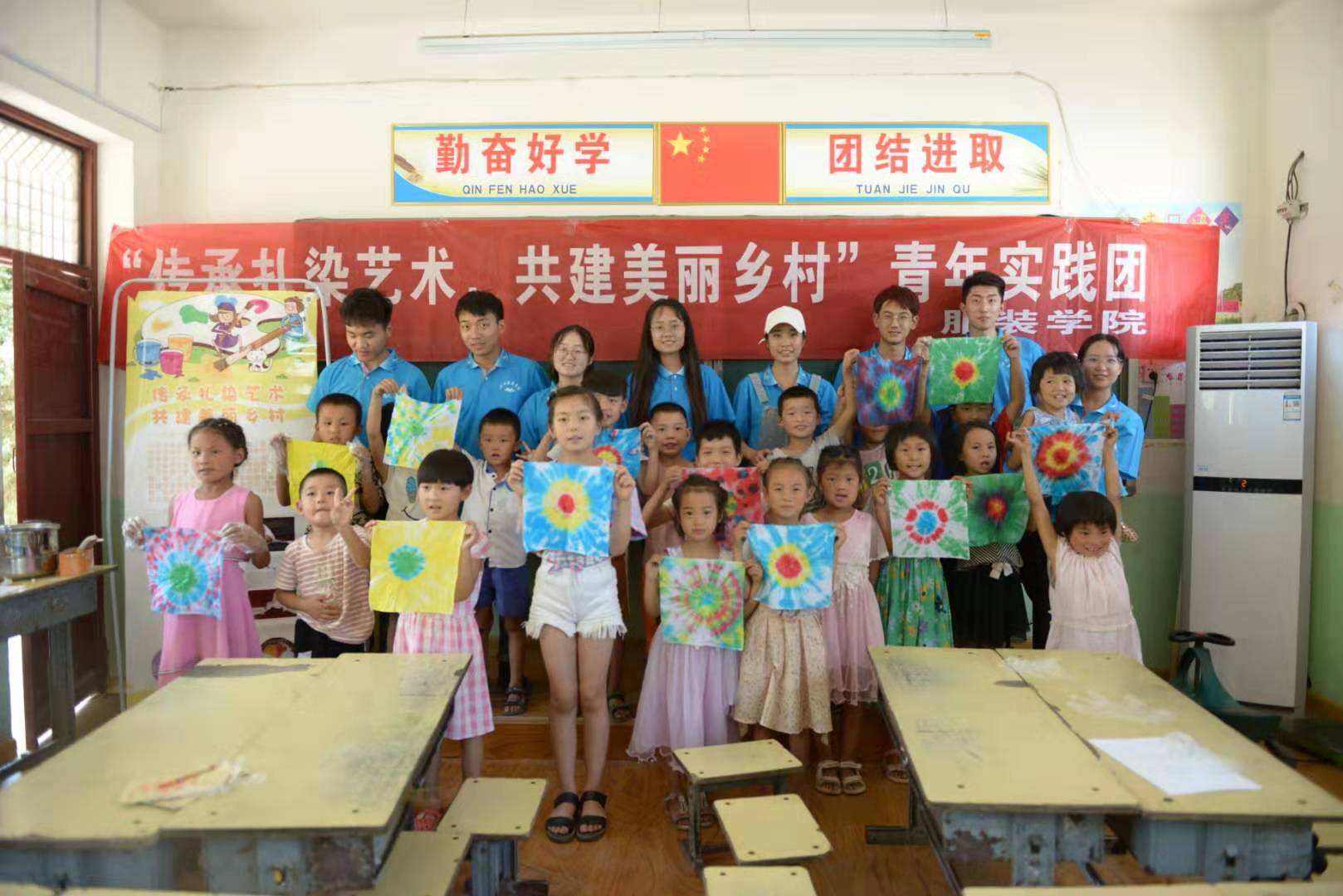 扎染古称扎缬、绞缬、夹缬和染缬,是中国民间传统而独特的染色工艺。扎染技法多变,晕色丰富,变化自然,趣味无穷。更使人惊奇的是扎结每种花,即使有成千上万朵,染出后却不会有相同的出现。这种独特的艺术效果,是机械印染工艺难以达到的。扎染显示出浓郁的民间艺术风格,1000多种纹样是千百年来历史文化的缩影,折射出中国民族特有的民情风俗与审美情趣,与各种工艺手段一起构成富有魅力的织染文化。青年实践团的队员们走进田间地头,走进校舍农家通过“展扎染作品,讲扎染历史,做扎染手工,传扎染文化”,展示了扎染这种中国民间传统而独特的染色工艺的魅力,利用所学专业知识传承民族优秀传统文化。扎染艺术进乡村不仅为村民带来了美的享受,提供高质量的精神营养,更传递了文化的自信,民族的自信。