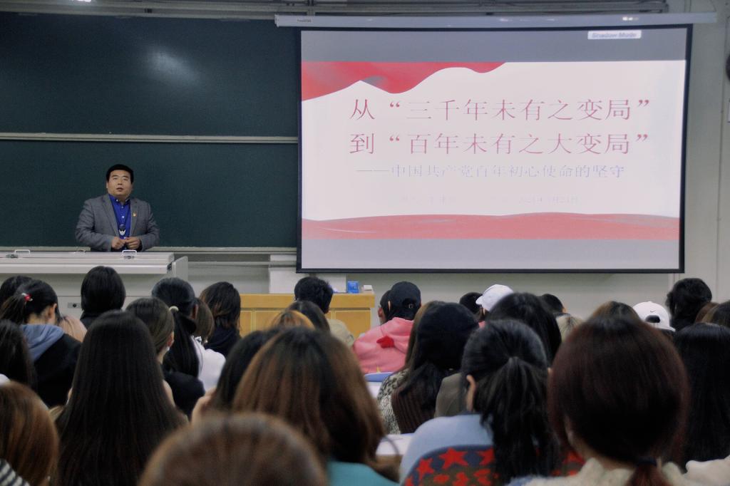 党委书记郭建勋在10#7教室为19级学生讲授“开学第一课”。郭建勋以“从‘三千年未有之变局’到‘百年未有之大变局’”为题,分为新民主主义革命时期、社会主义革命和建设时期、改革开放和社会主义现代化建设新时期四个部分来讲述党史的发展。他鼓励同学们向革命英雄前辈学习,做有理想、有本领、有担当的新青年。