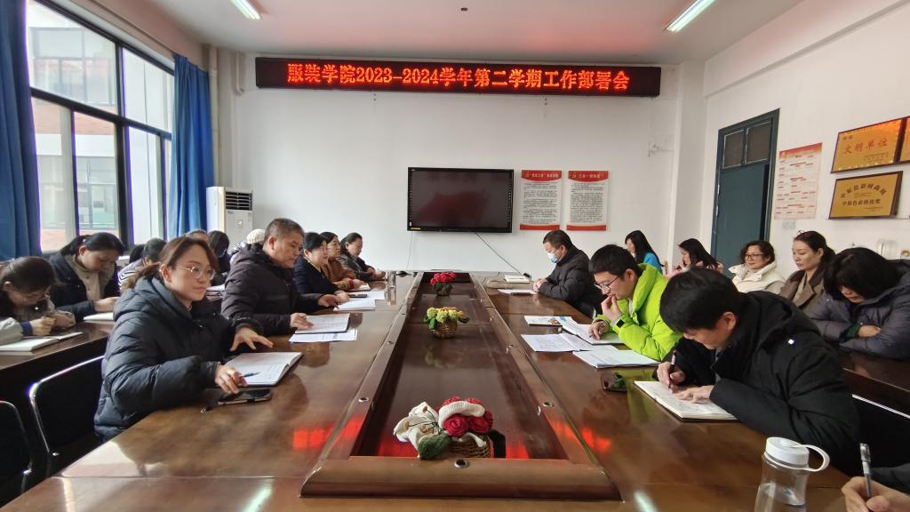 在11#204会议室召开2023-2024学年第二学期工作部署会,学院领导班子和全体教工到场参加。会议由院党委书记游红伟主持。