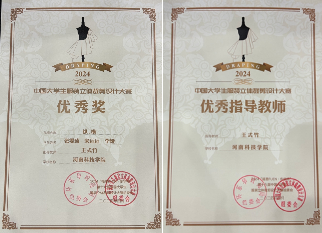 2024“福恩FUEN•东华杯”第16届中国大学生服装立体裁剪设计大赛于近日在东华大学举办。服装学院艺术设计研究生张雯琦、宋远远、李娅的立裁作品《纵·横》荣获优秀奖,指导老师王式竹荣获大赛“优秀指导教师奖”。