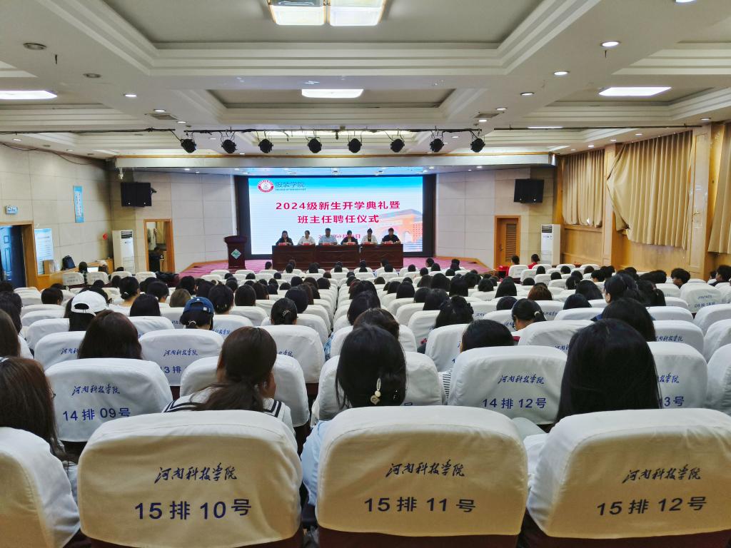 于图教201举行2024级新生开学典礼暨班主任聘任仪式。学院党政领导、辅导员老师、2024级新生班主任及全体新生参加,大会由党委副书记高莉主持。