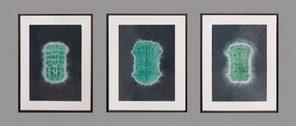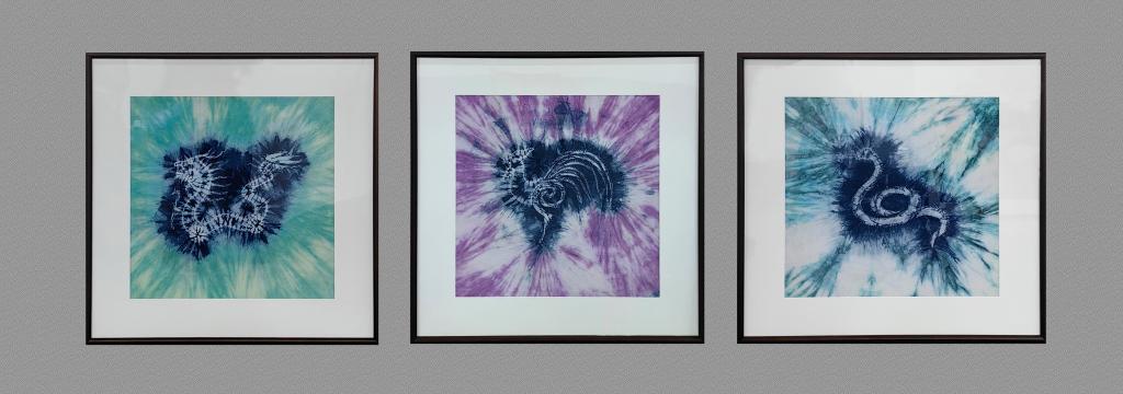 《二里头铜牌饰》及《十二生肖》郭海燕代表性的原创作品二里头文化是中国青铜时代的早期文化,亦是华夏文明的主流将染缬艺术与二里头铜牌饰的文化元素相结合,使二里头文化以新的形式得到传播和弘扬十二生肖中国民俗文化的核心符号,染缬艺术将十二生肖的图案转化为可触摸的织物艺术,让非遗技艺在当代生活中找到落脚点,实现传统工艺活化民俗文化再生的双重价值。在创作手法上,郭海燕巧妙融合了扎染、蜡绘染及创意染等手法,通过细腻的针法及大胆的笔触,丰富的色彩运用,构建出极具视觉冲击力的画面。