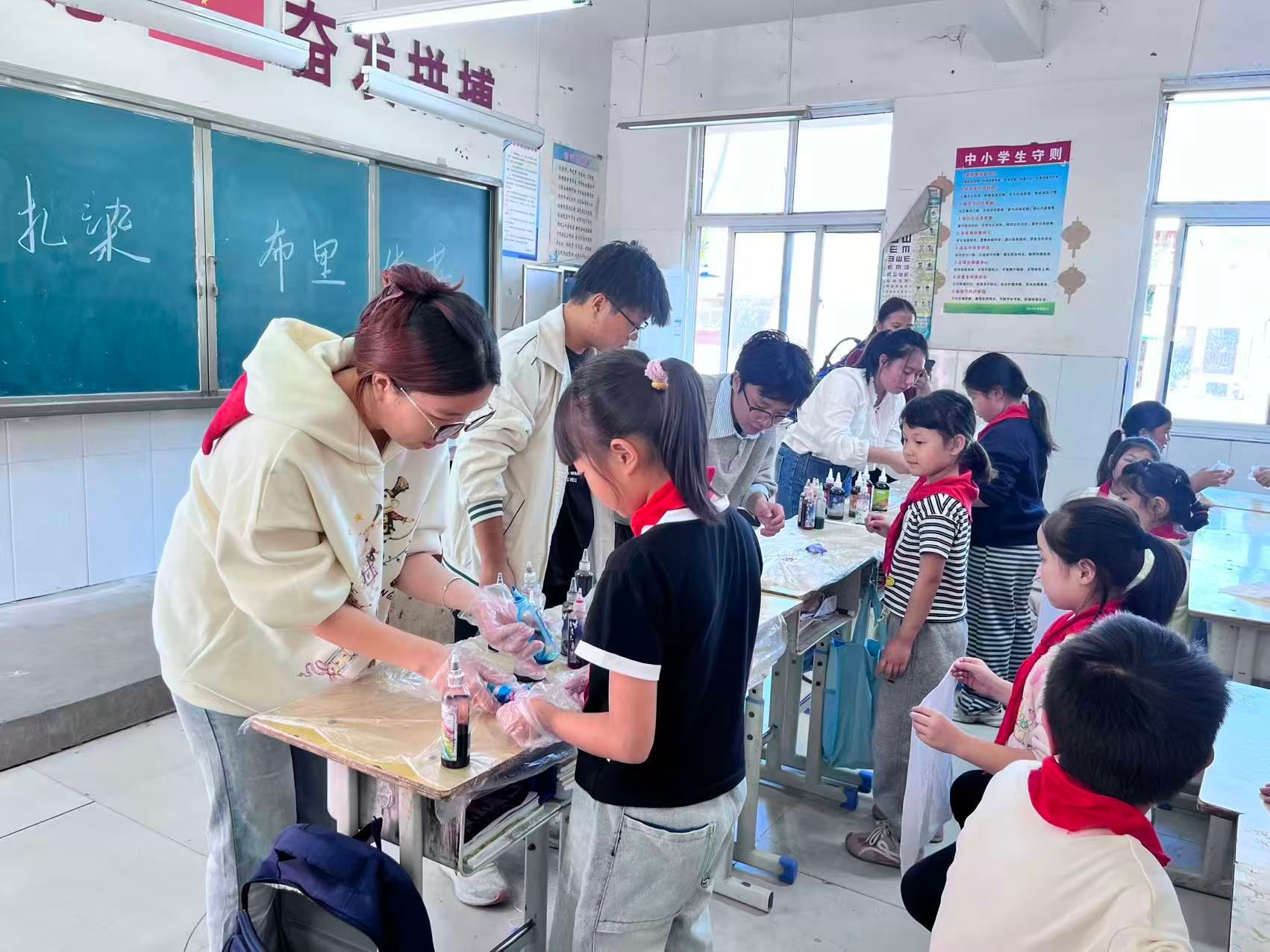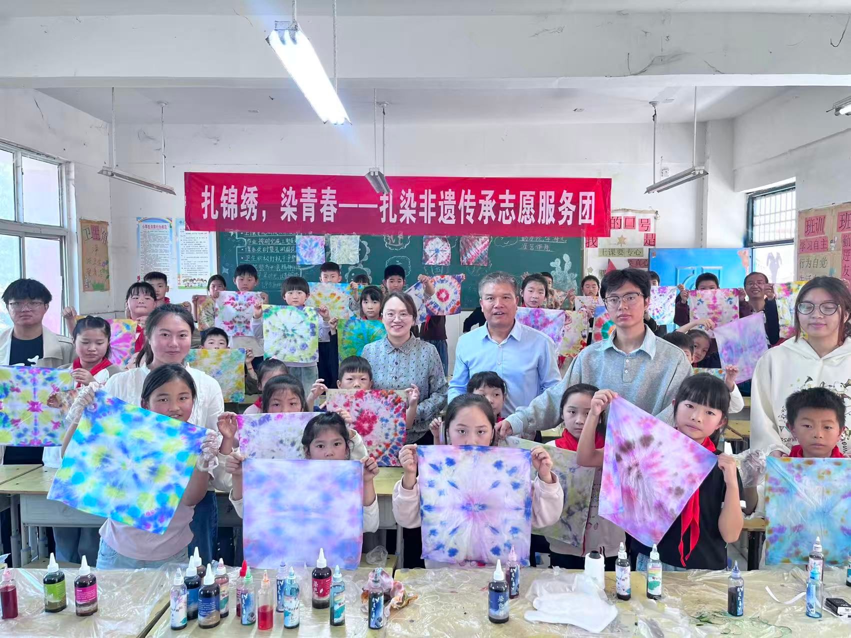 “扎锦绣·染青春”扎染非遗传承志愿服务团成员赴黄陵镇旧黄陵村小学,开展“扎锦绣·染青春”扎染主题非遗传承志愿服务活动。