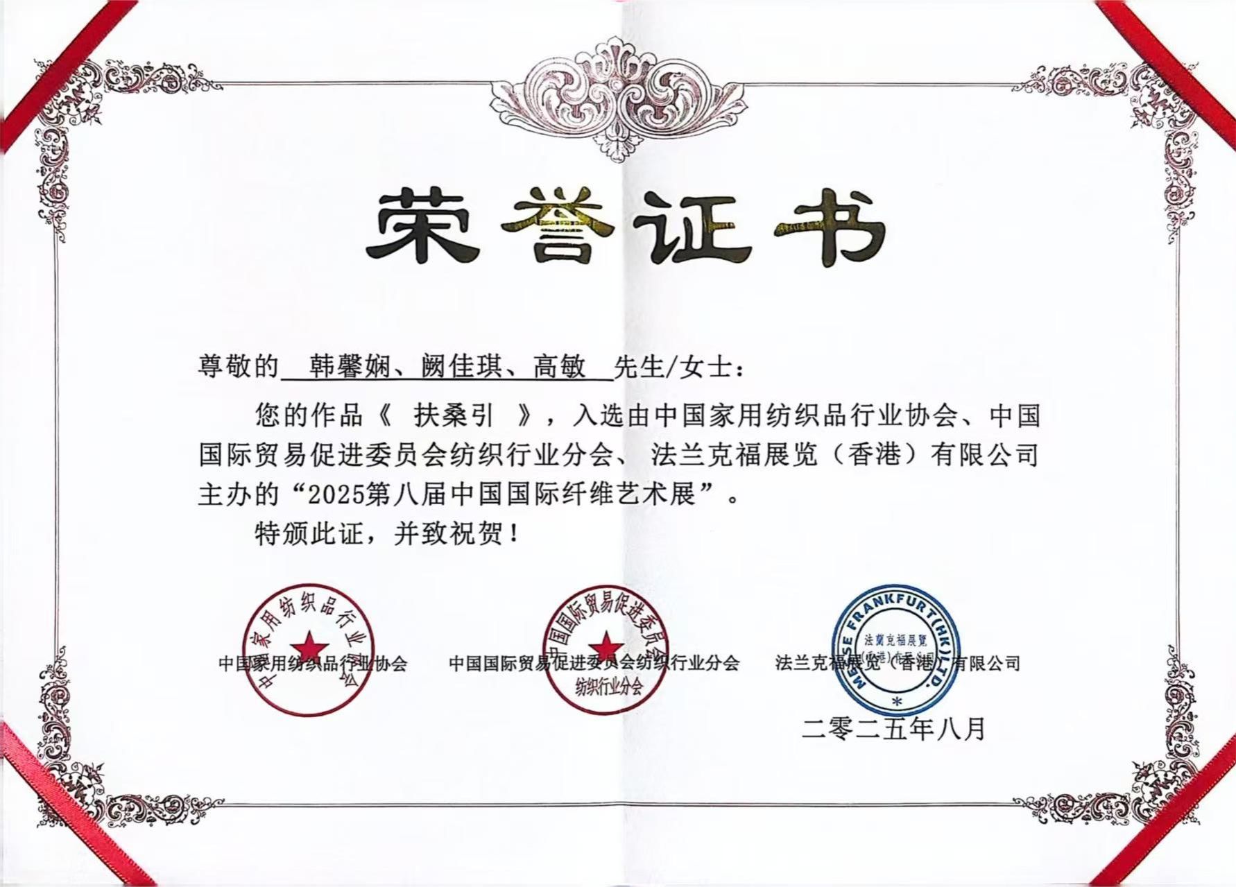 教师韩馨娴指导本科生阙佳琪、高敏,凭借作品《扶桑引》成功入围并参展,作品立足纤维艺术的传统底蕴与当代创新,展现出扎实的专业基础与独特的创作思维。