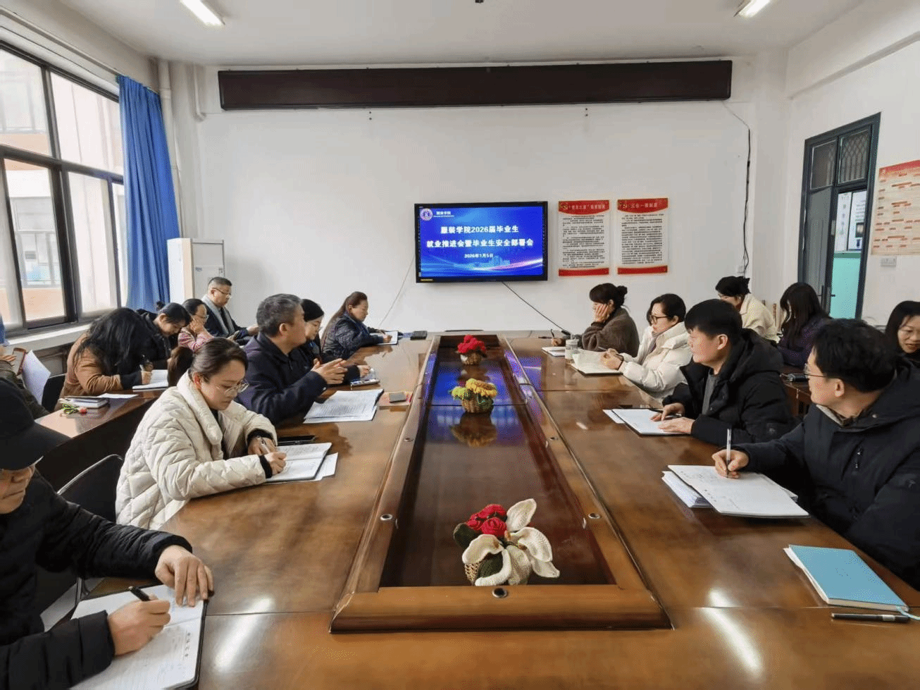 在11#204会议室召开2026届毕业生就业推进会暨毕业生安全部署会。学院全体领导和教职工参加会议,会议由学院党委书记游红伟主持。