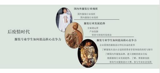 袁慧慧总监首先从后疫情时代国内服装产业现状、通过丰富的产品案例和数据,指出服装行业产品创新、全渠道运营、可持续环保理念等的发展趋势。并从自身工作实际和大家细致分享了服装从设计企划到消费者穿着体验的流程与细节,从而提出服装专业学生应从建立清晰的就业目标、掌握服装专业技能、注重服装专业大赛积累等方面提升专业核心竞争力。