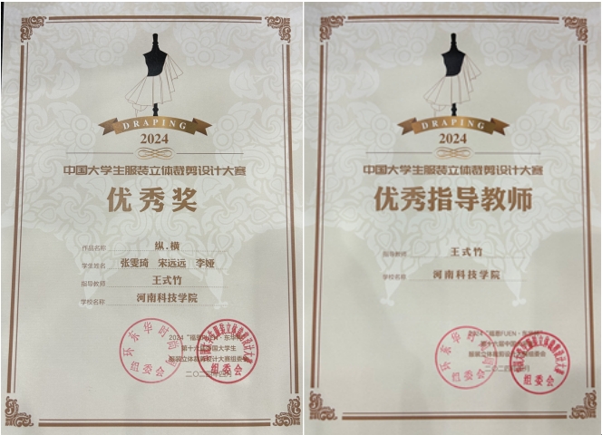 2024“福恩FUEN•东华杯”第16届中国大学生服装立体裁剪设计大赛于4月22日-26日在东华大学举办。服装学院艺术设计研究生张雯琦、宋远远、李娅的立裁作品《纵·横》荣获优秀奖,指导老师王式竹荣获大赛“优秀指导教师奖”。