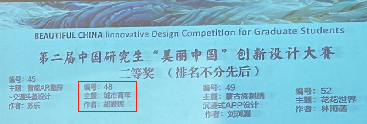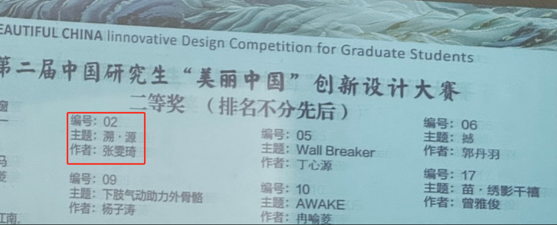 王式竹、刘淑丽等老师指导的硕士研究生张雯琦作品《溯·源》、胡颖辉等作品《城市青年》在第二届中国研究生“美丽中国”创新设计大赛中斩获两个二等奖,为我校赢得了荣誉。