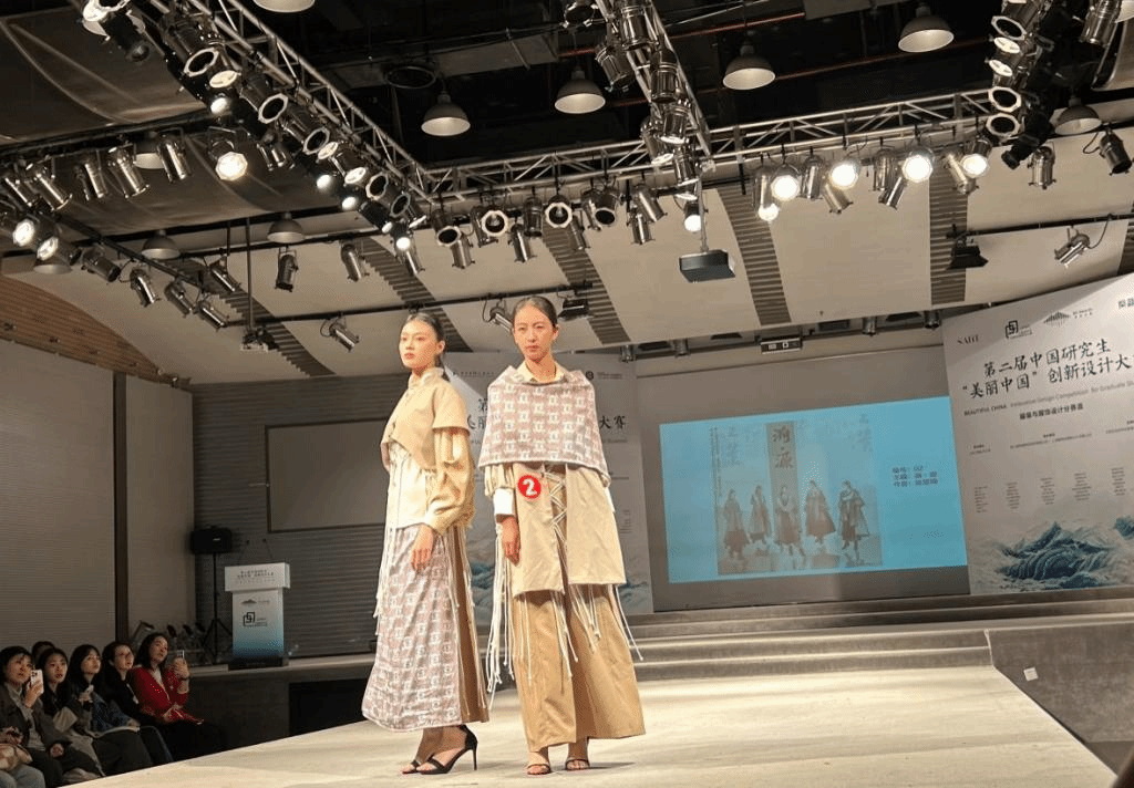 中国研究生“美丽中国”创新设计大赛是由教育部学位管理与研究生教育司指导,中国学位与研究生教育学会、中国科协青少年科技中心共同主办。大赛历时近4个月,经初赛专家线上评审,42所高校的142支团队入围决赛,其中27所高校的57支队伍参加现场一、二等奖评选的线下决赛。张雯琦作品《溯·源》灵感来源于仰韶文化中的庙底沟类型彩陶,提取了庙底沟彩陶纹样运用在服装设计中,在服装中采用手工棉绳编织和数码印花来展示庙底沟彩陶纹样之美,是仰韶文化的当代传承设计,满足现代服饰的文化内涵要求。胡颖辉等作品《城市青年》将户外潮流、城市生活、传统手工艺扎染三者巧妙地结合在一起,强调穿着的多样性与中国传统文化的继承和创新。